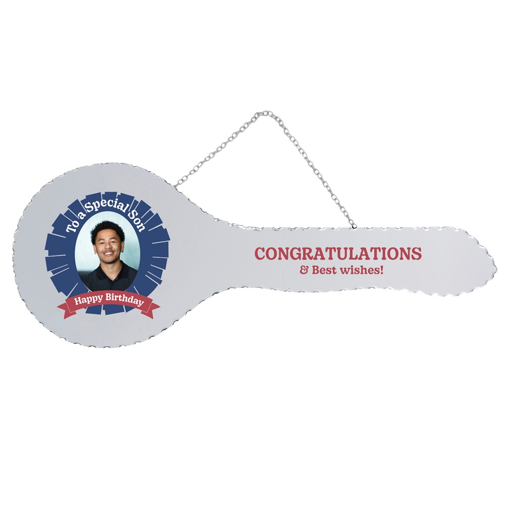 Designed for that sporty rugby union/league male or female and featuring a lovely kiwiana fern design and space for a photo. This is a mirrored 21st key with a 9mm MDF backing so the key can be signed by guests and loved ones. It also features a scalloped edge and hangs from a 340mm silver look chain. Size: 524mm x 205mm.