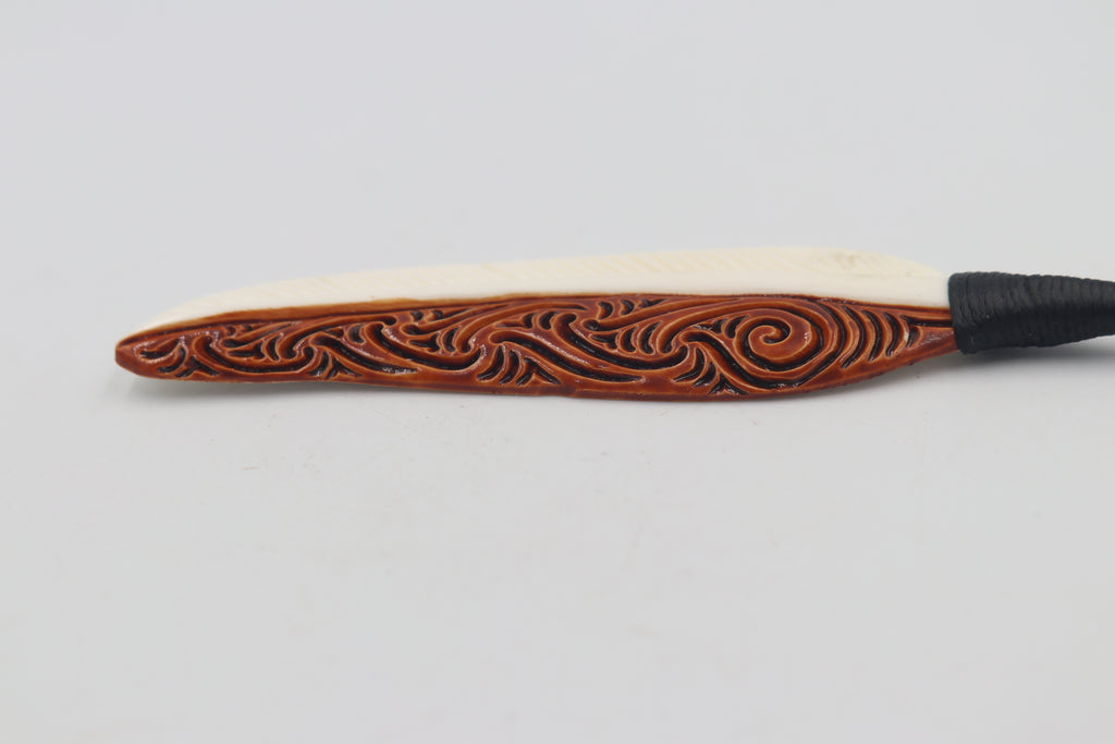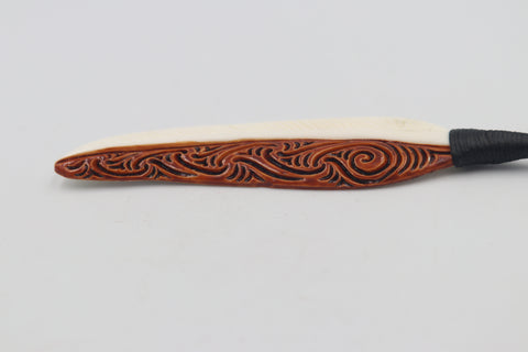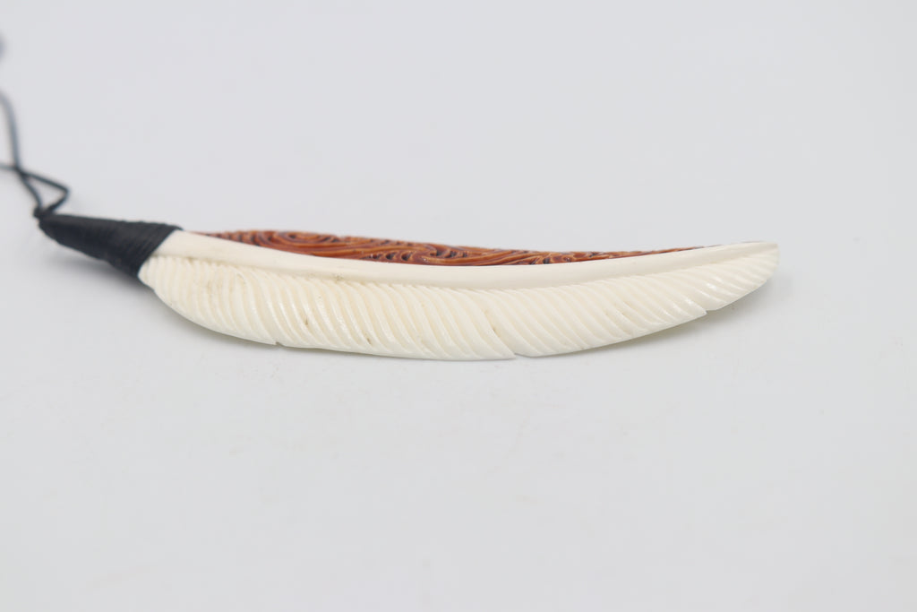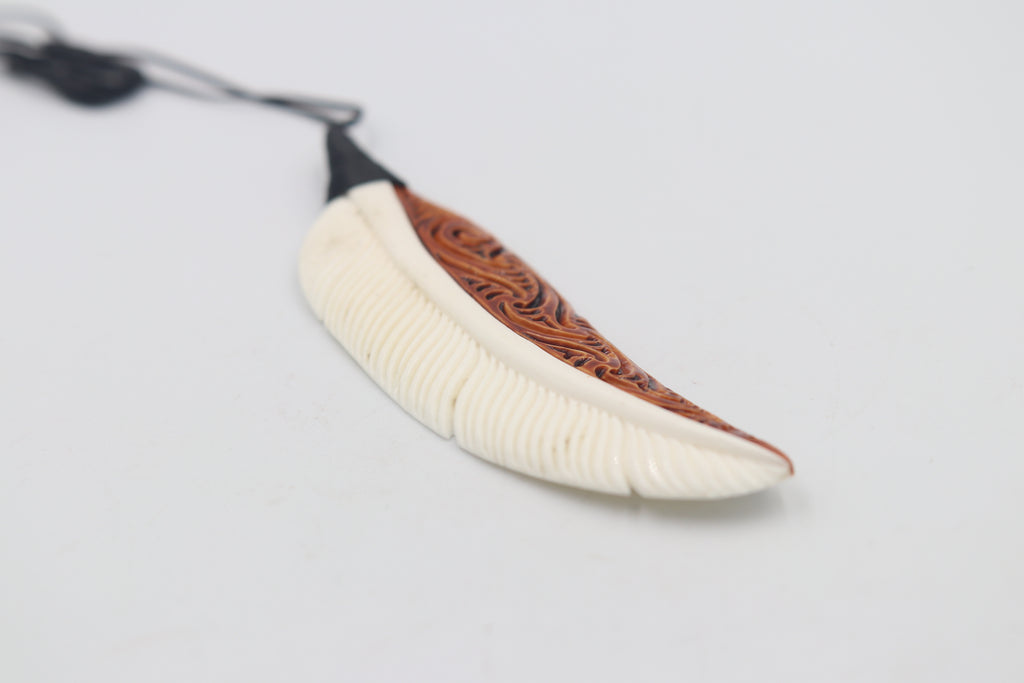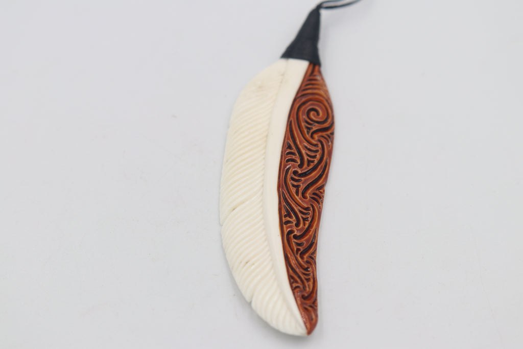 This bone carving is a beautiful piece of Maori jewellery. This pendant has wonderfully detailed carving. The natural beef bone has a stained section to enrich its beauty. The matching earring code is BE021.