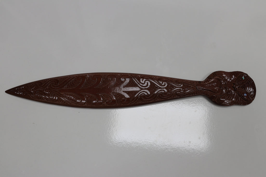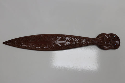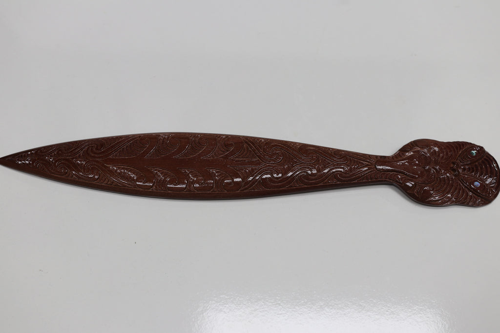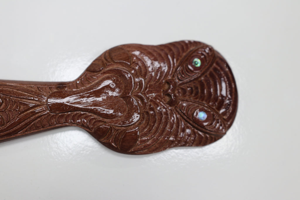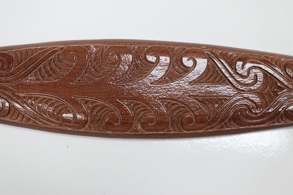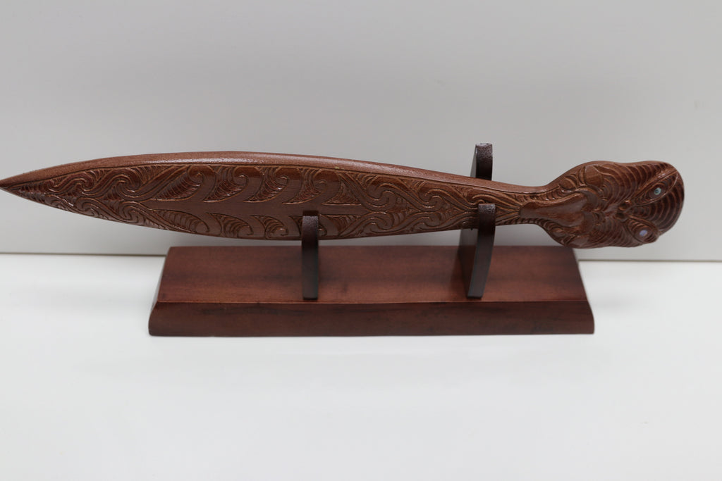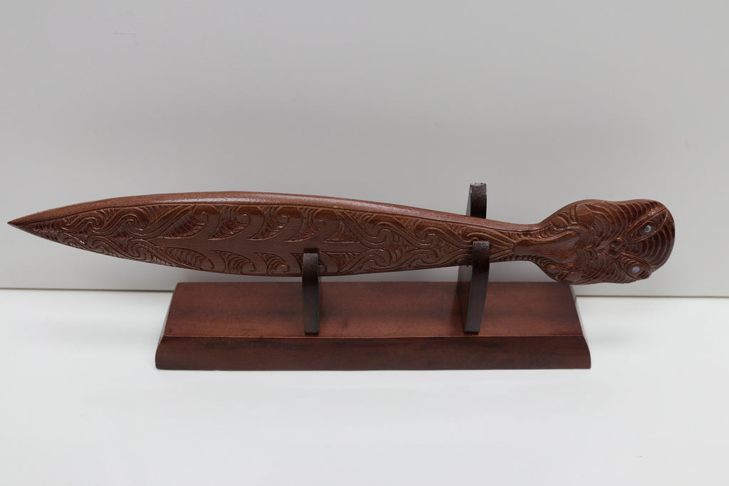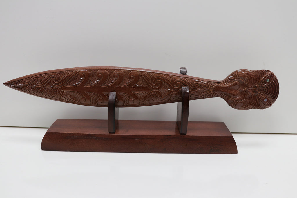 This mini paddle has the front face carved with an intricate pattern. The stand disassembles so that it can be easily transported. Beautifully hand-carved from Mahogany wood. Makes a great trophy or award.