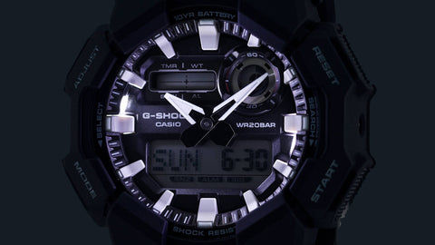 Enjoy a life of fewer battery changes with a large-case G-SHOCK with a 10-year battery you won’t have to worry about for ages. The analog-digital GA-010 delivers handy features like world time and stopwatch, as well as a high-brightness LED light, which can be easily accessed from the large button on front of the case, ensuring visibility even in the dark. Made with bio-based resin and equipped with a 10-year battery, this G-SHOCK is great if you want to reduce environmental impact. Available in a selection of black-based workstyle color schemes for a cool design that moves with ease from casual settings to work situations.