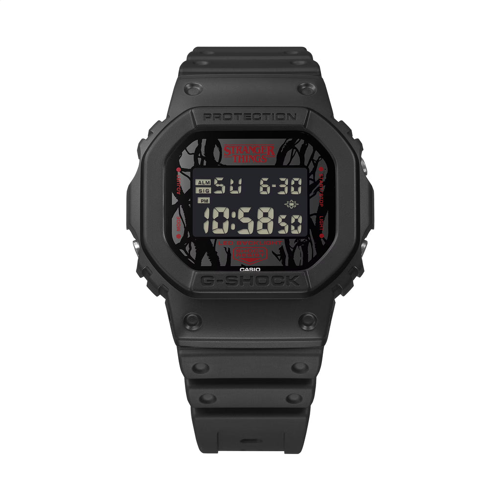 A special collaboration model with the Netflix series "Stranger Things," which will reach its final chapter with Season 5 in November. This timepiece is based on the DW-5600. Drawing from the dual worlds of the story — the familiar reality and the eerie “Upside Down” — the design weaves key elements of the series into every detail. The dial features a pattern of twisting vines, evoking the creeping influence of Vecna. In a clever touch, the letter “A” in “LED BACK LIGHT” appears upside down, hinting at the connection between dimensions. The red backlight mirrors the show’s signature color palette, casting an atmospheric glow reminiscent of its most intense moments. On the band loop, “011” is printed — a tribute to Eleven, one of the show’s most powerful and beloved characters. The watch comes in special packaging that highlights both the Demogorgon and the signature vines, capturing the threatening forces the characters face throughout the series. This special collaboration celebrates the arrival of Season 5, the final chapter in the Stranger Things saga. Stranger Things Stranger Things is a Netflix mystery adventure series set in the 1980s in the small town of Hawkins, Indiana. The story revolves around the sudden disappearance of a young boy named Will and the appearance of a mysterious young girl named Eleven. A group of young friends are determined to solve the extraordinary mysteries they encounter as they try to protect friends and family. Combining dramatic twists and turns, thrilling tension, and the friendships and exciting adventures of a group of young characters, Stranger Things is full of homages to classic 1980s movies and has been a global megahit since its first season in 2016. The show has sparked a movement so big that it has become a worldwide phenomenon. The final season, Season 5, will be released in November 2025. STRANGER THINGS™/© Netflix. Used with permission.