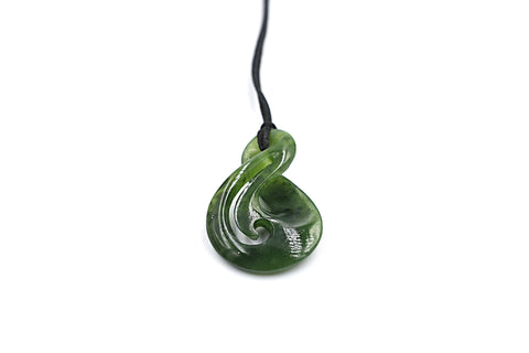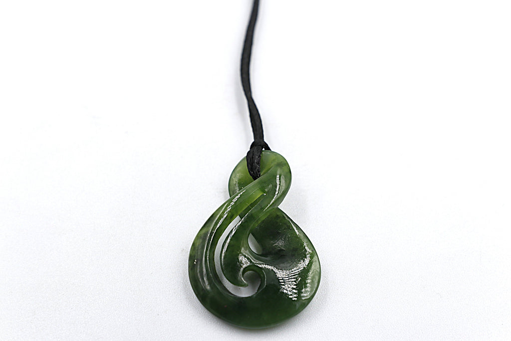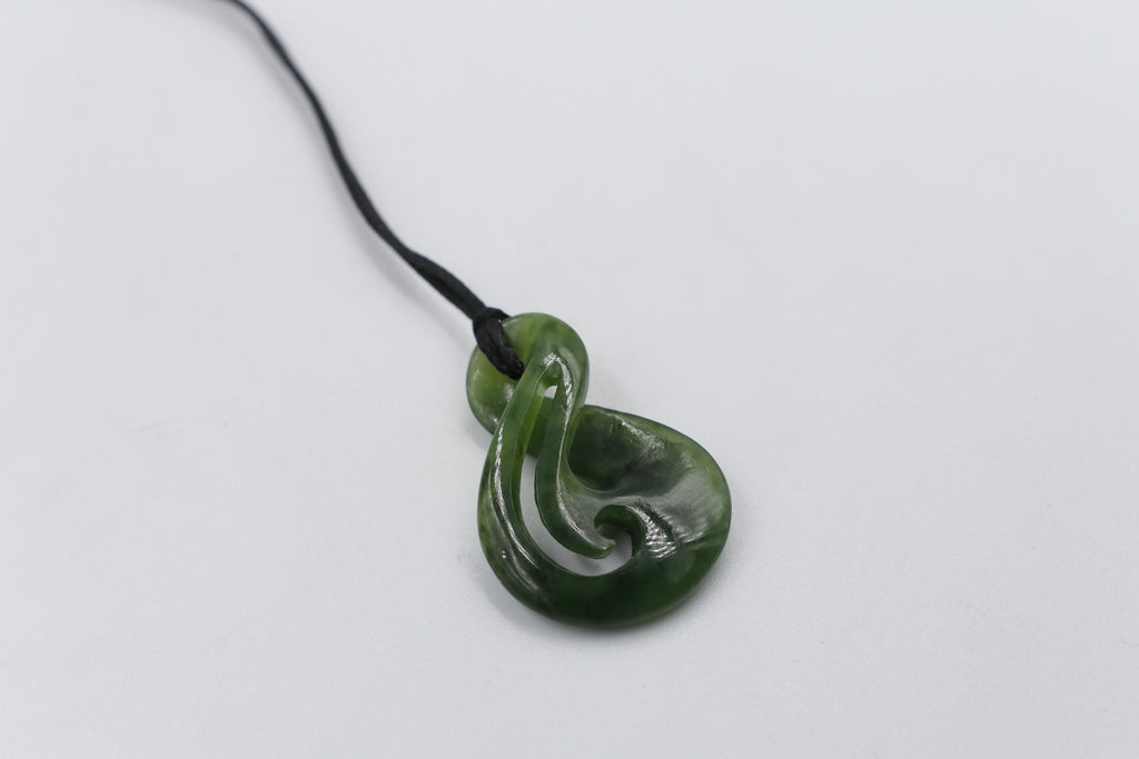 The spiral is a Koru, represents the fern found as it opens bringing new life and purity to the world. It also represents peace, tranquility and spirituality along with a strong sense of regrowth or new beginnings. The Koru is also often associated with nurturing so when interlocked with others is frequently used to represent the strength and purity of a loving relationship with family.