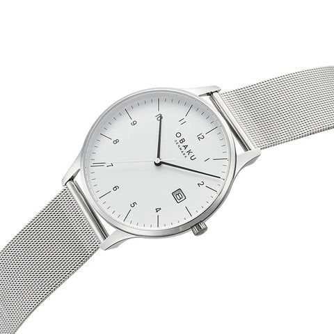 The Obaku Chia Steel is a sophisticated gents watch with a 42mm diameter and rounded edges for a sleek profile. Crafted entirely from corrosion-resistant stainless steel, including the case and easy-switch mesh bracelet, this timepiece is built for durability. The white dial features easy-to-read black numbers and hands, with extra-long hands that extend to the edge for a touch of elegance. The date window adds functionality, while the second hand, matching the dial color with a colored tip, adds a unique detail.