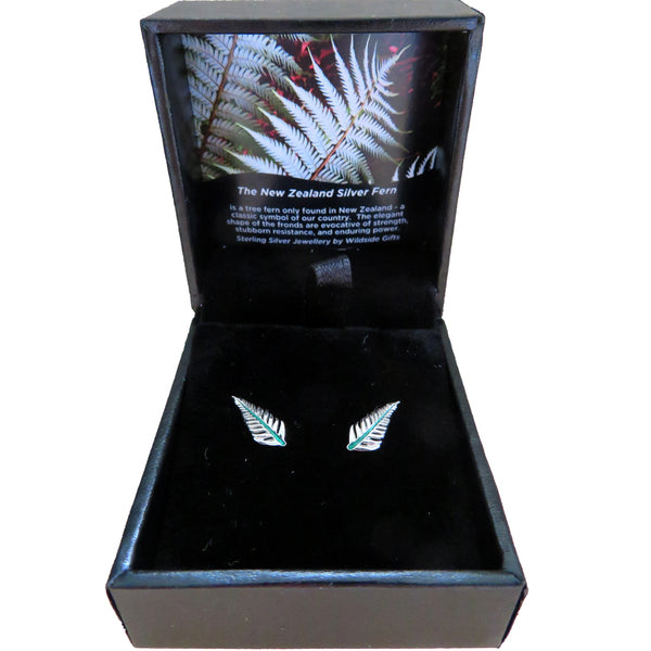Delicate, little sterling silver fern studs with a thin line of green enamel on the leaf vein. They are 13mm long by 6mm wide and come in a classic Gifts jewellery box.