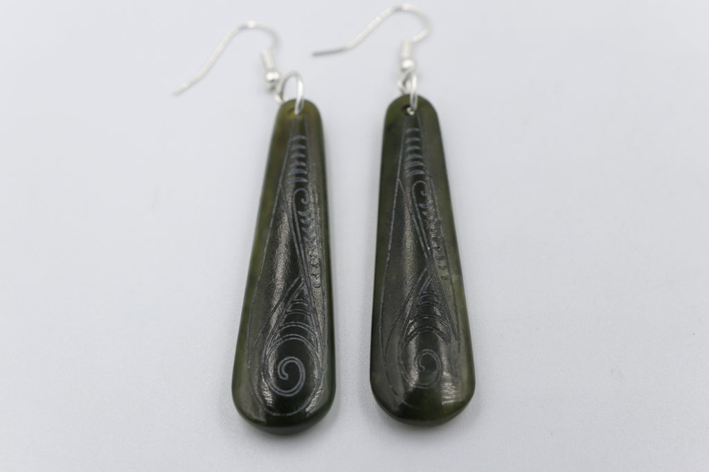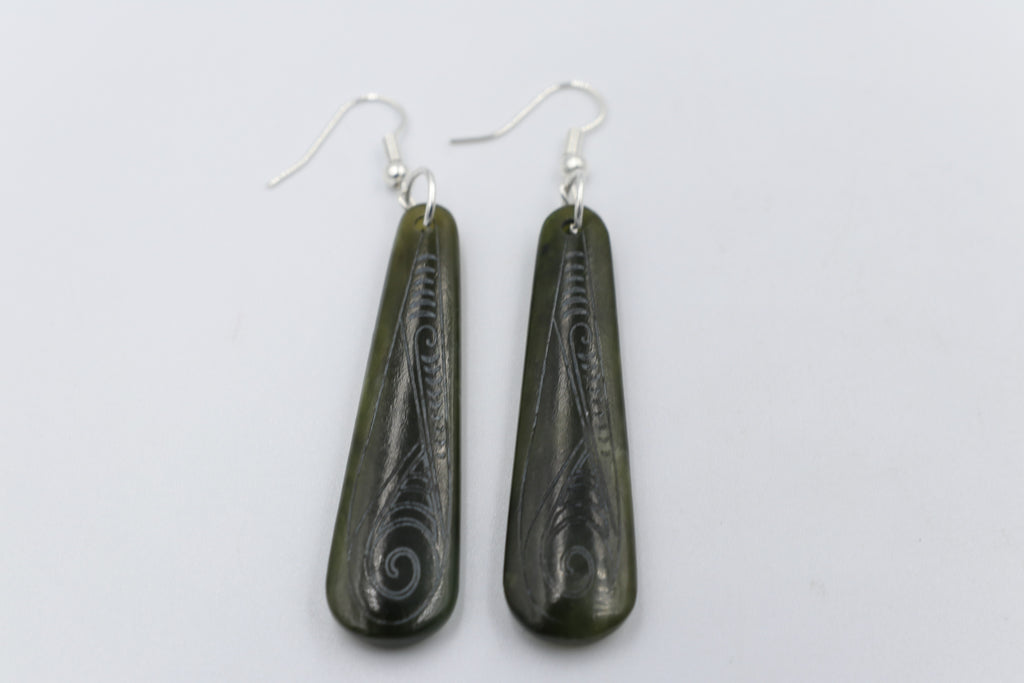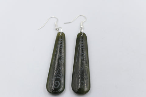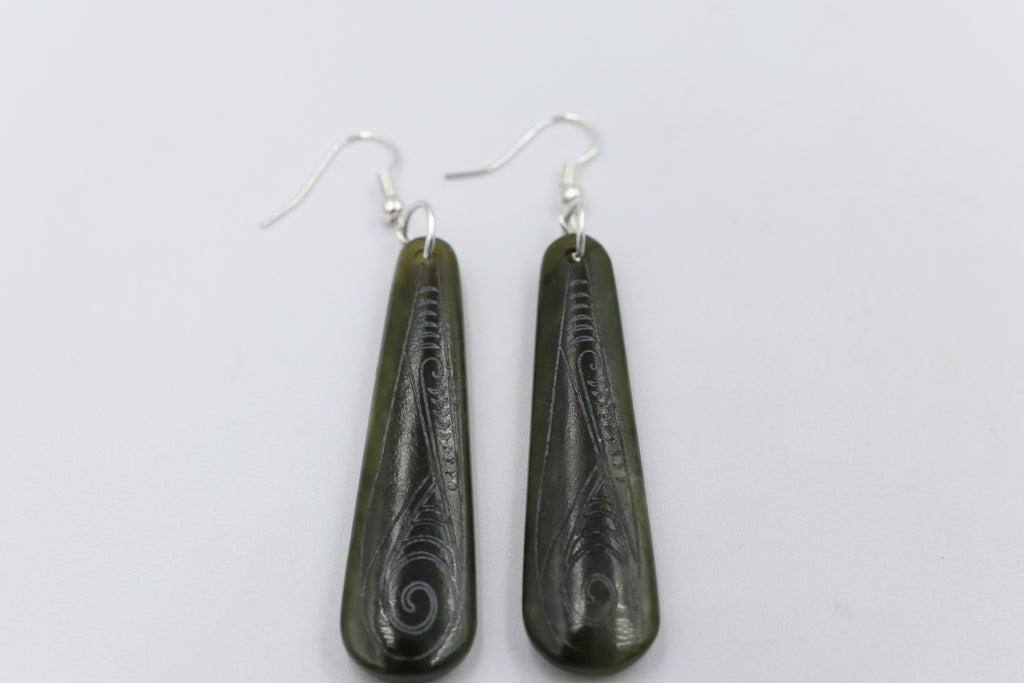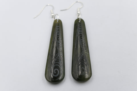 New Zealand Greenstone Stg silver set Engraved Drop Earrings