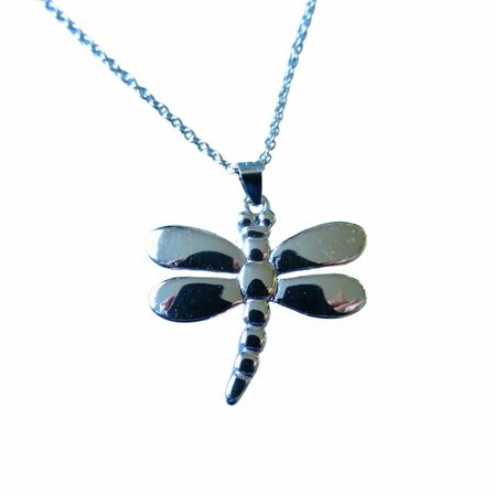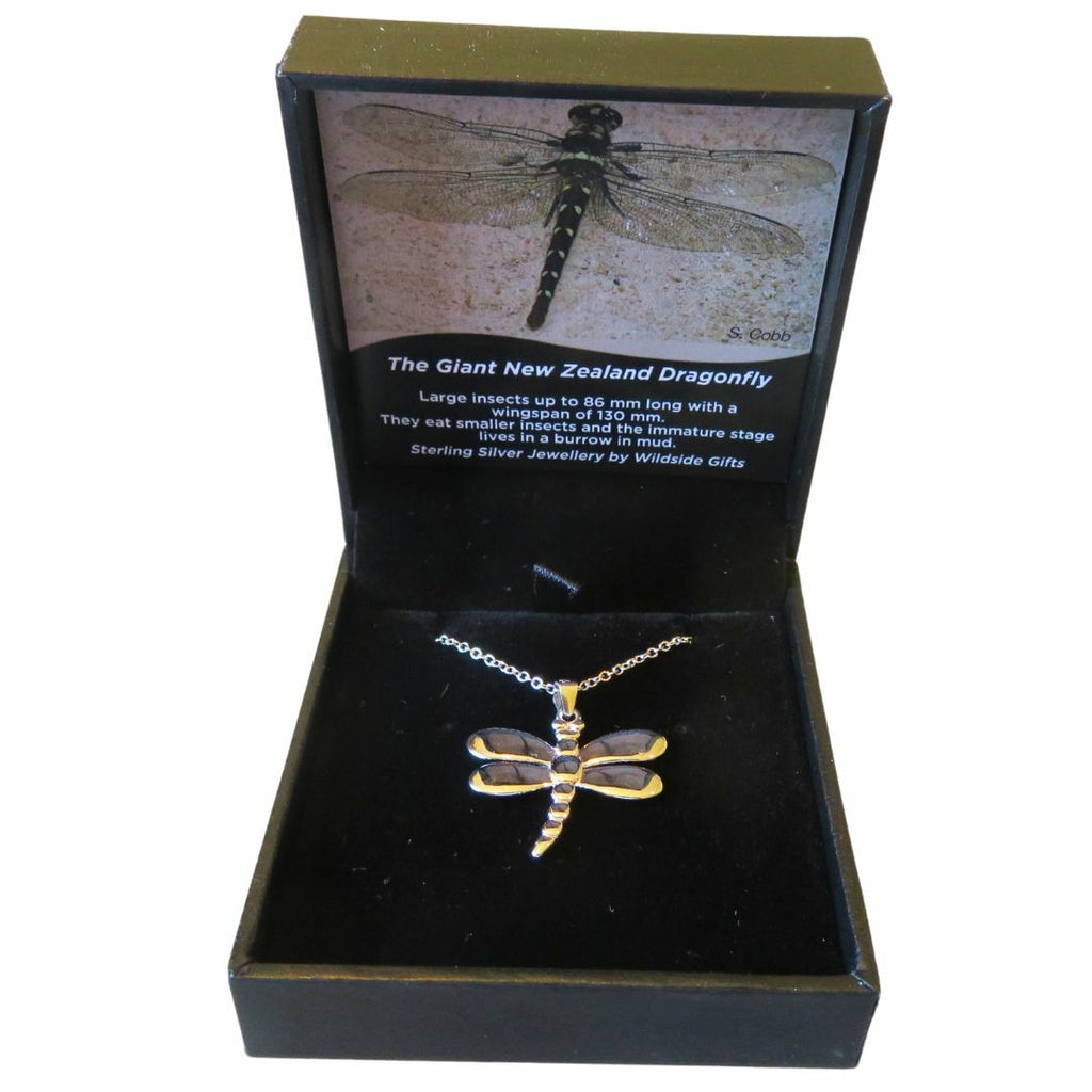 A beautiful solid sterling silver pendant 29mm wide by 25mm long on a sterling silver chain (approximately 45cm long). It comes packed in a lovely jewellery box with an information card on which appears: "The Giant New Zealand Dragonfly: large insects up to 86mm long with a wingspan of 130mm. They eat smaller insects and the immature stage lives in a burrow in the mud."